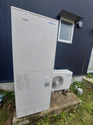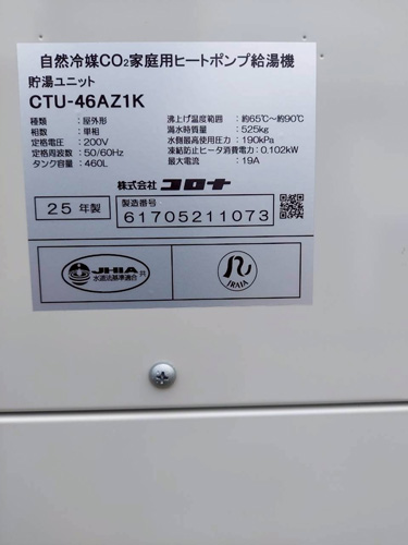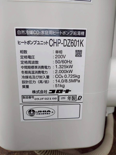 天草市本渡町 コロナ自然冷媒CO2家庭用ヒートポンプ給湯機ヒートポンプユニットCHP-DZ601K、貯湯ユニットCTU-46AZ1K エコキュート交換工事